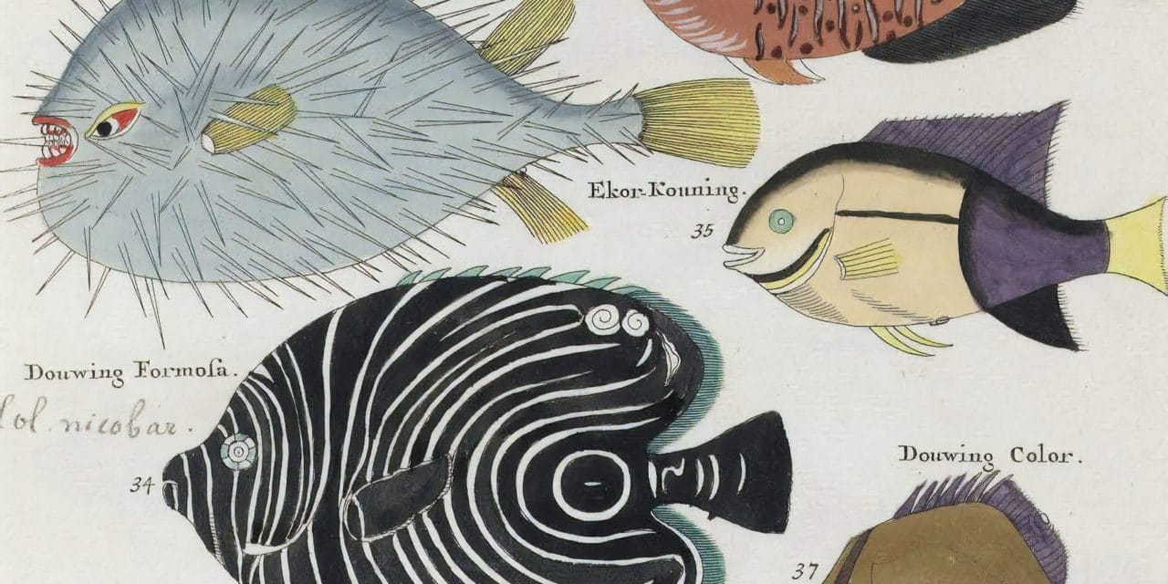 Publié à l’origine en 1719, avec une deuxième édition en 1754, Poissons, Ecrevisses et Crabes peut se targuer d’être la première publication en couleur connue sur les poissons – en l’occurrence, célébrant ceux des eaux des Antilles. Ce livre merveilleux est la création de Louis Renard – un éditeur, libraire et espion de la Couronne britannique (employé par la reine Anne, George I et George II). Ce dernier rôle, qui l’a vu contribuer à garantir la succession protestante au trône en refusant les subsides de James Stuart, n’était pas particulièrement secret et il semble que Renard s’en soit servi pour ajouter de la singularité à ses livres. Cet ouvrage, par exemple, est de fait dédié à George I, et la première page décrit l’éditeur comme « Louis Renard, Agent de Sa Majesté Britannique ».